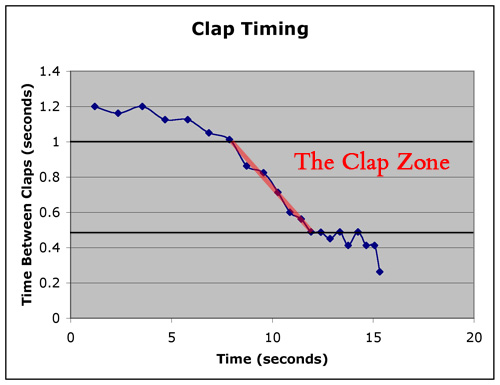 You can see that the first 6 or so claps are at regular intervals of about 1 second (still in the initial stage of slow clapping). Below 1 second between clap, however, things begin to speed up quickly, and after only about 4-5 seconds, the slow clap has broken down into full on applause.